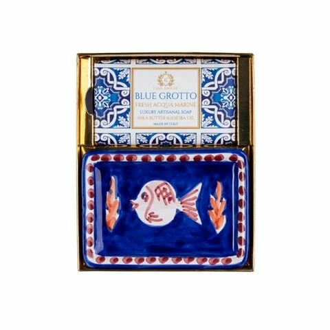 This chic White & Gold Box contains a Blue Grotto – Fresh Acqua Marine Luxury Artisanal Soap and a hand painted ceramic soap dish made in Vietri Sul Mare. It’s simply out of the box.